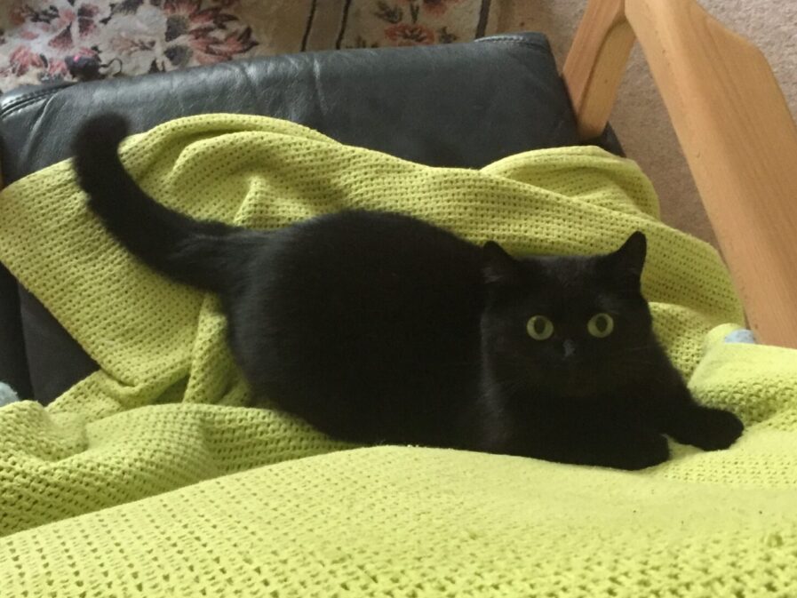 Mira wurde als verwilderte Katze auf der Sichtern gefunden. Nach langem geduldigen anlocken mit Futter auf einer Grasmatte konnte Monika das Vertrauen der sehr scheuen schwarzen Katze gewinne.